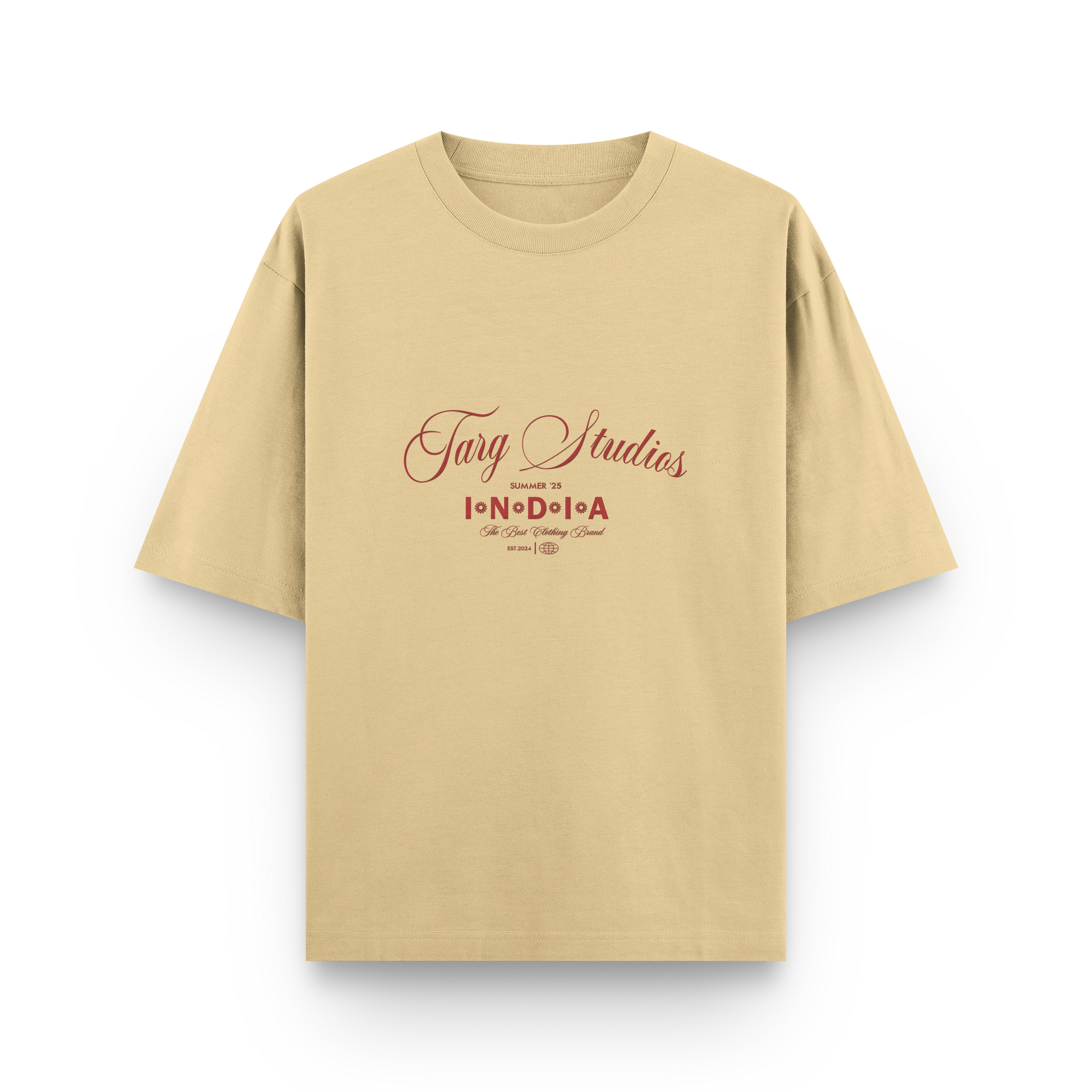 A beige studio essential featuring bold red typography — Targ Studios, India, Summer '25. The design draws from archival aesthetics and vintage brand markings, reinterpreted through a contemporary lens. Subtle sleeve prints complete the studio look.